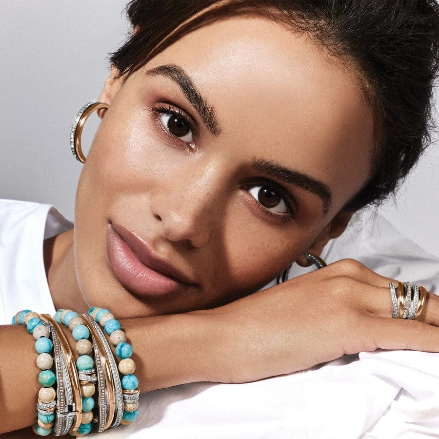 Turquoise Jasper semi-precious stone beads symbolizing wisdom and protection encircle this comfortable stretch bracelet accented with the motif from the Neptune’s Rings Collection. Because we have used natural materials, each stone is truly one of a kind and may have variations in color.
